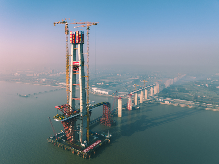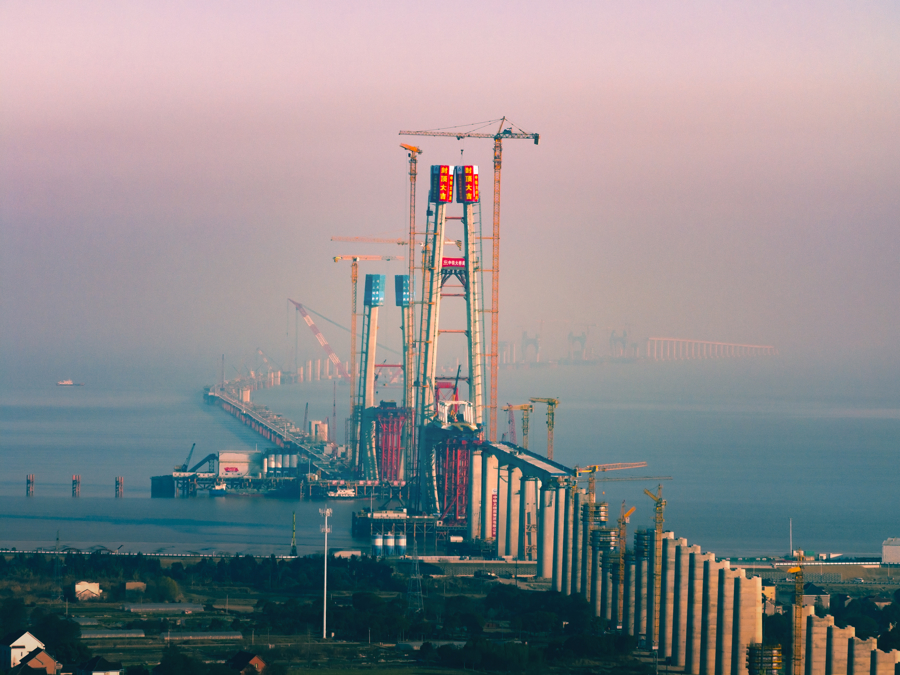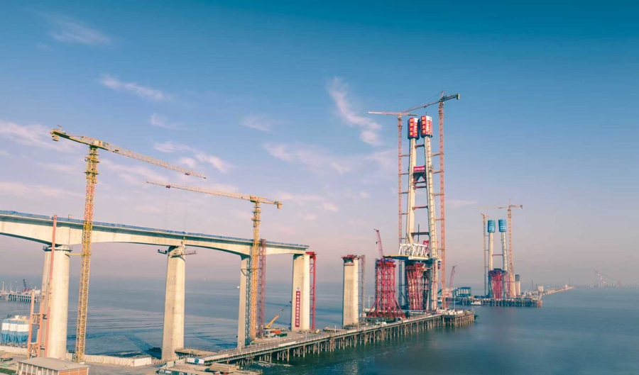 1月16日12时58分,世界最长跨海铁路大桥——杭州湾跨海铁路大桥建设迎来关键节点。在杭州湾海盐侧离岸0.4公里的海面上,由上海国铁建管公司建设管理、中铁大桥局承建的北航道桥高达200米的8号主塔成功封顶。这是大桥全线三座航道桥、7座主塔中首座封顶的主塔,标志着这一超级工程建设取得重大阶段性进展。